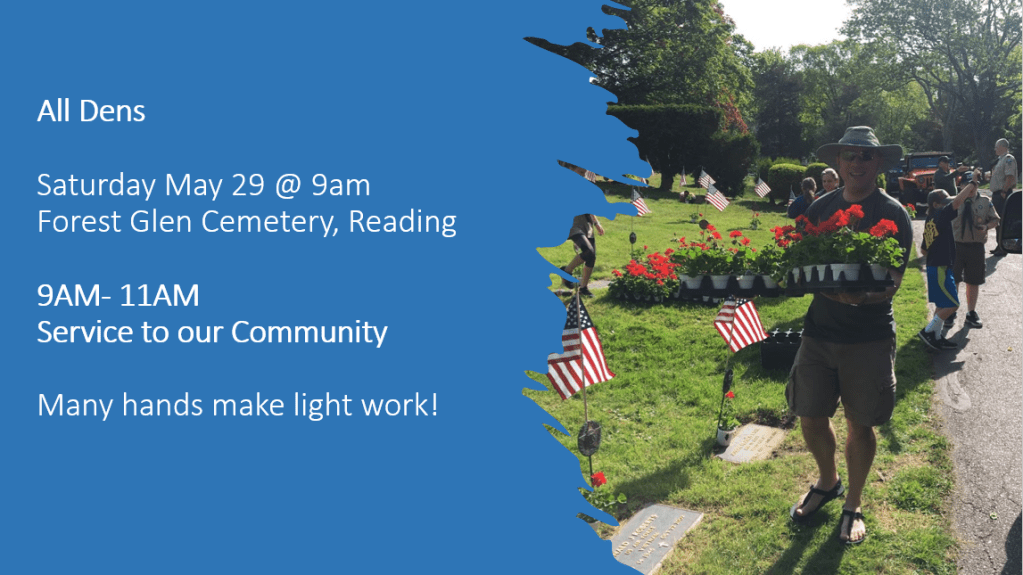 Please be awesome and join us this Saturday, May 29th at 9am at Forest Glen Cemetery to place flags and flowers on veteran graves. All Dens, all Scouts and both parents are invited. We’ll be socially distanced and covering a wide area. Many hands make light work. Be there for me and Reading -Masks required.