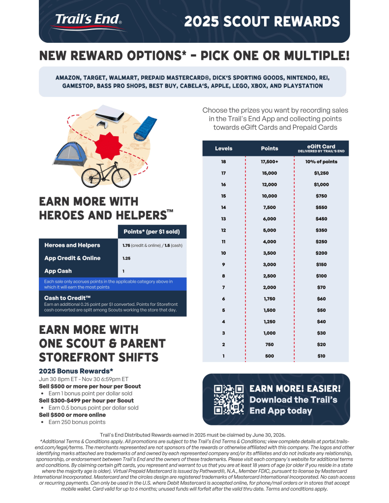 - Trail’s End Scholarship Program – Scouts in the Scholarship Program who sell at least $2,500 (online, face-to-face, or combination) in any calendar year* ending on or before December 31st will have 6% of their Qualified Sales count towards their own Trail’s End Scholarship.
